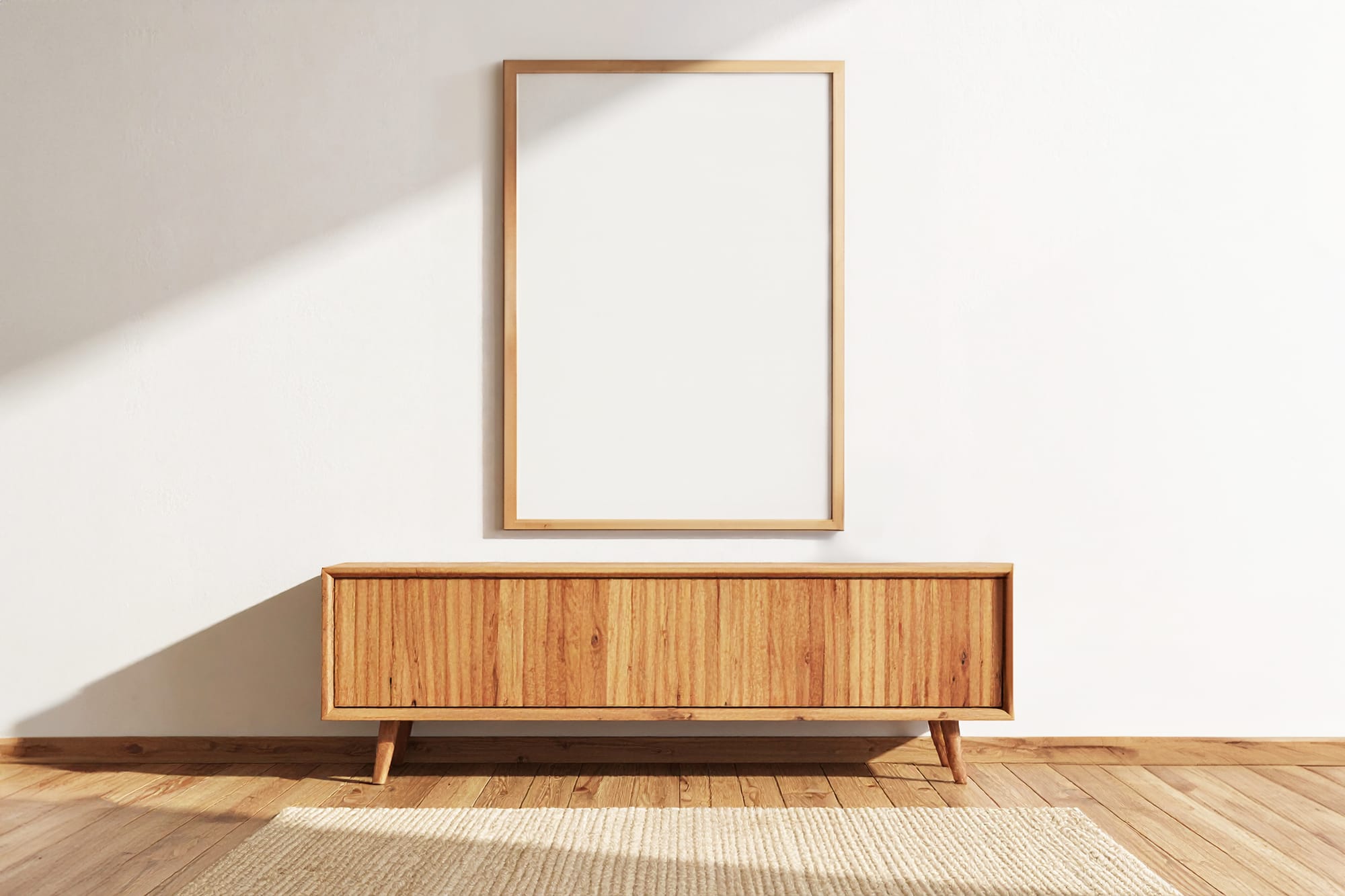 Minimalist Sunshine Frame Mockup featuring soft natural sunlight and a clean interior, ideal for presenting poster designs, wall art, and branding visuals in a warm and modern environment.